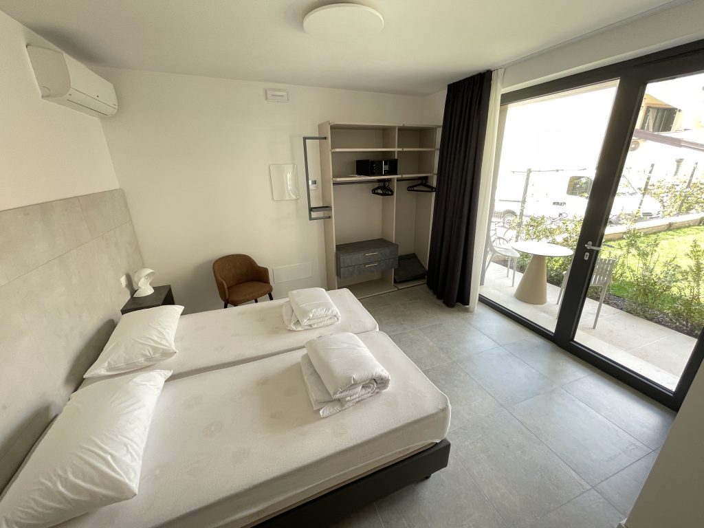 Great choice for your relaxing holiday with family and children. This spacious room has a queen-size bed and two additional single beds. The modern interior design as well as the open living area will let you enjoy your stay from the very beginning. From the private balcony you can look out over the rooftops and enjoy the sun all day long. For your comfort, our rooms are of course equipped with air conditioning, a flat screen TV, room safe and free wi-fi. The bathroom is equipped with a shower, tasteful tiles and a hairdryer. The room size is approx. 25 sqm.